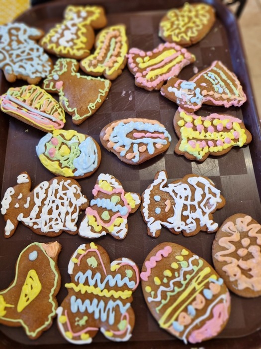 Obyvatelé se s chutí pustili do vykrajování velikonočních motivů. Společné chvíle u pečení byly nejen voňavé, ale i plné vzpomínek na to, jak se slavily Velikonoce dříve v rodinách. Celý domov se díky společnému úsilí rozzářil barvami jara. Výzdobu najdete nejen v jídelně a společenské místnosti, ale i na chodbách a u vstupu. Velikonoční přípravy nám opět připomněly, jak důležité jsou chvíle strávené společně.