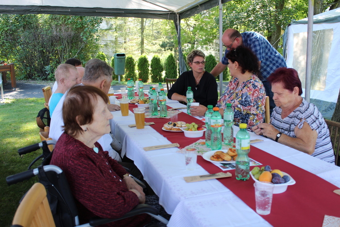 Slavnost se konala v krásné zahradě bruntálského domova, kde bylo připraveno bohaté občerstvení a velmi krásný program. V úvodu nás přivítala paní ředitelka Pohody a mohl začít krásný program. Nejdříve vystoupily děti všech věkových kategorií z taneční školy Stonožka. Následovaly Aktivní seniorky, které jsou opravdu aktivní. Zlatým hřebem byla Cimbálovka Vedrovci z Opavy, se kterou jsme si všichni společně pobrukovali známé písničky.