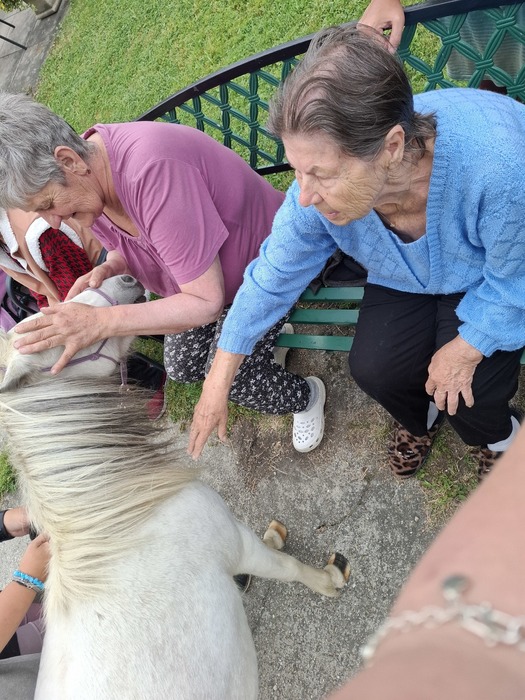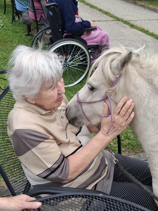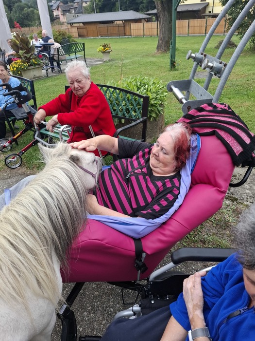 Do Domova pro seniory Vrbno zavítala v uplynulých dnech vzácná návštěva – pětiletá ponice jménem Topinka, která se věnuje hipoterapii. Uživatelé i zaměstnanci domova měli možnost strávit čas s tímto milým zvířecím hostem a vyzkoušet si blahodárné účinky kontaktu se zvířaty. Topinka si rychle získala srdce přítomných svou klidnou povahou a trpělivostí. Senioři ji mohli hladit, česat, krmit i vést na krátké procházce po zahradě domova. Pro mnohé to byla příležitost připomenout si chvíle z dětství či mládí, kdy sami vyrůstali na vesnici a se zvířaty byli v každodenním kontaktu. Hipoterapie, tedy terapeutické využití kontaktu s koňmi, má pro seniory řadu přínosů. Přispívá k uvolnění napětí, podporuje jemnou i hrubou motoriku, navozuje pocit klidu a bezpečí a v neposlední řadě přináší radost a dobrou náladu. Setkání s poníkem také podporuje komunikaci a posiluje sociální vazby mezi klienty i personálem. Pro většinu našich seniorů byla návštěva poníka Topinky nejen zpestřením běžného dne, ale také hlubokým emočním zážitkem. Úsměvy a rozzářené oči byly důkazem, že zvířata mají jedinečnou schopnost rozdávat radost a pohodu.